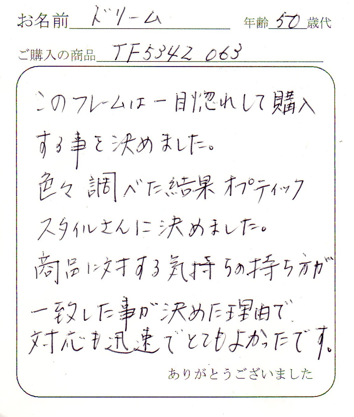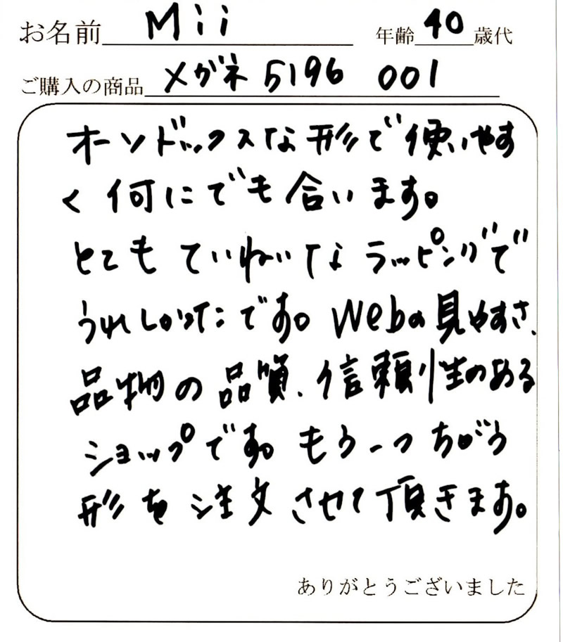 もともとは近所の某セレクトショップに試着に行き、そこで購入しようとしておりましたが、御社のレンズ付きでの価格とメガネだけの金額がほぼ同じでした。ネットでのオーダーだったので若干不安でしたが、オーダー後の早い対応とメールのFolow upで全く問題無く対応頂けました。