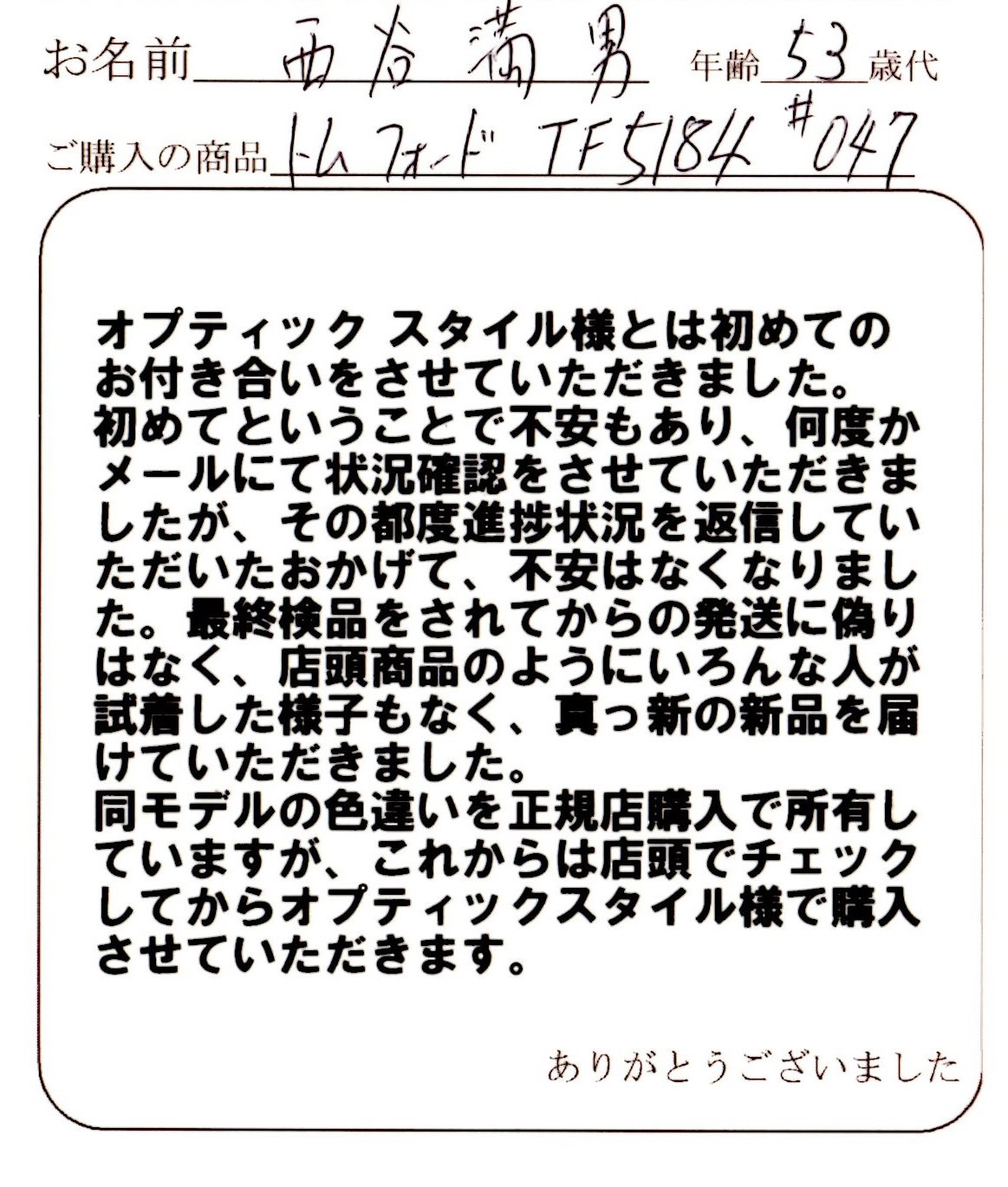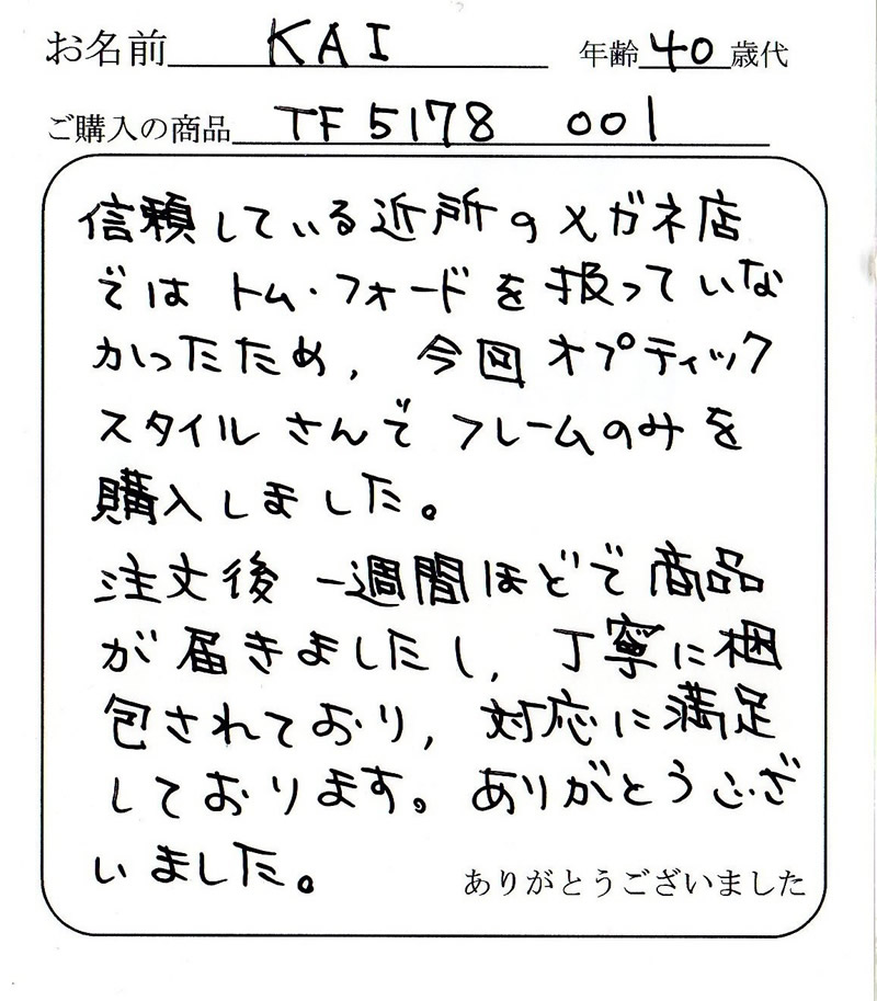 信頼している近所のメガネ店では、トムフォードを扱っていなかったため、今回オプティックスタイルさんでフレームのみを購入しました。