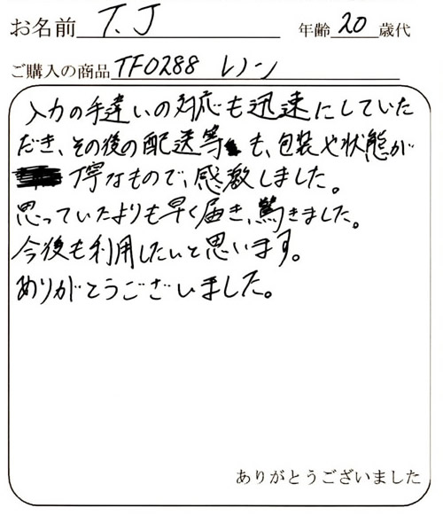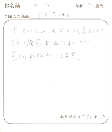 すぐに商品の発注、発送をして頂き、ありがとうございます。