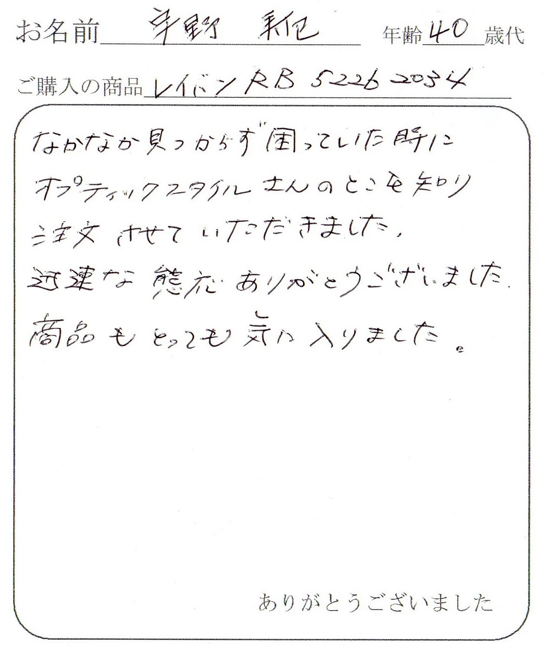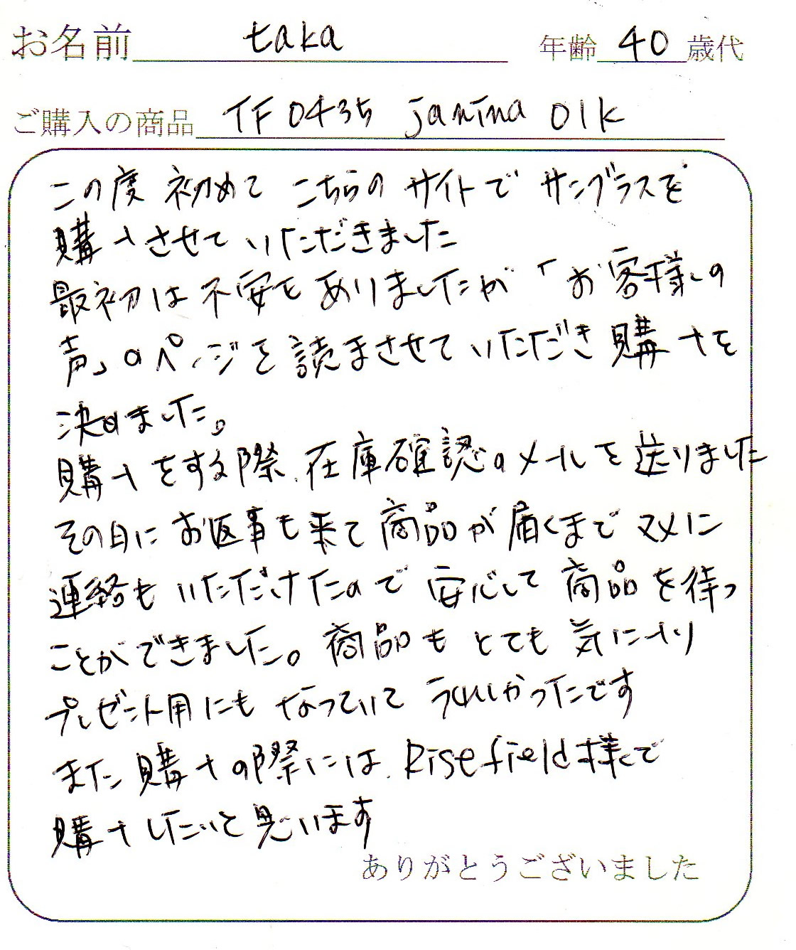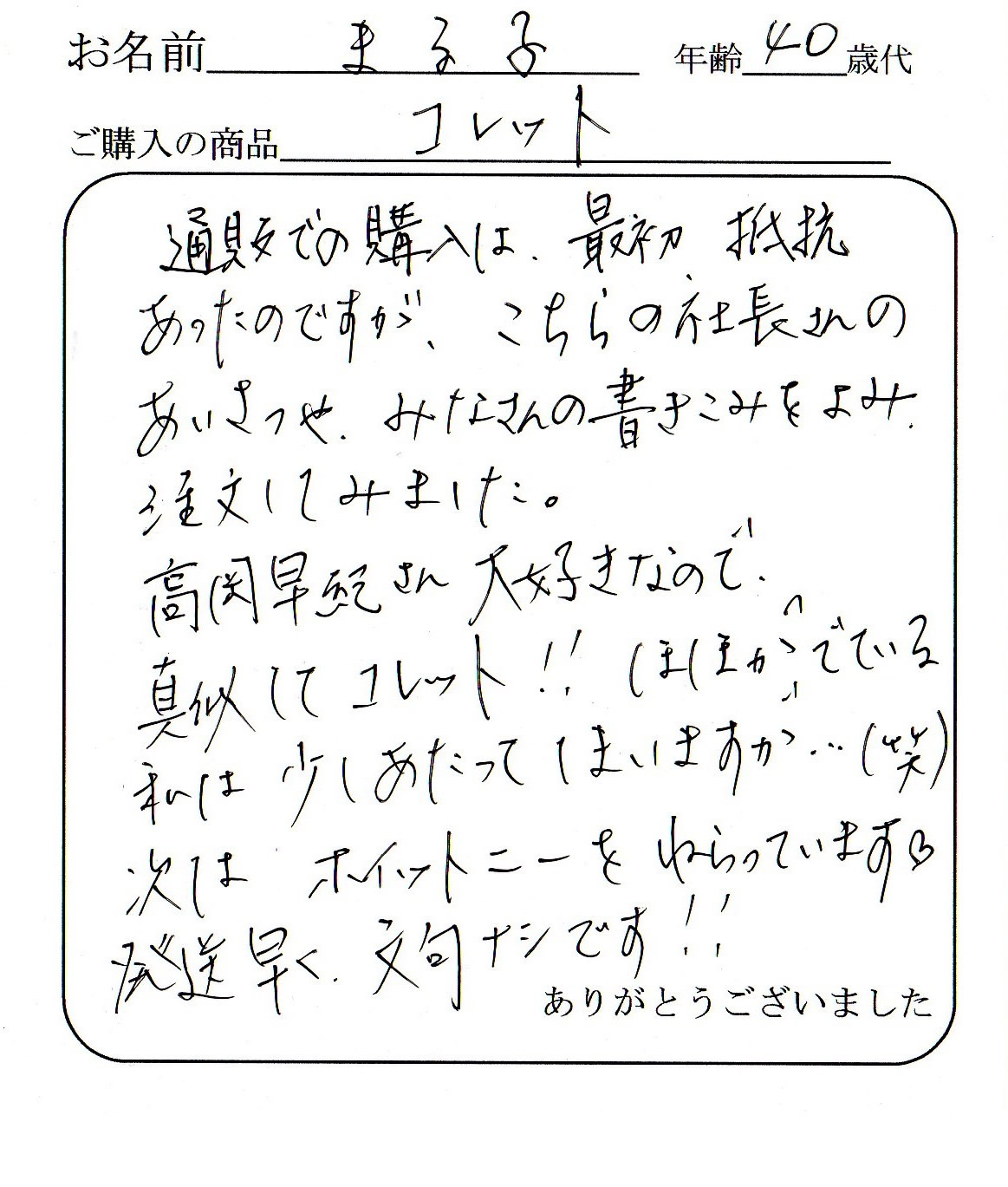 ご購入いただいたお客様から、商品に同封させていただいたハガキで、頂いた声を紹介します。