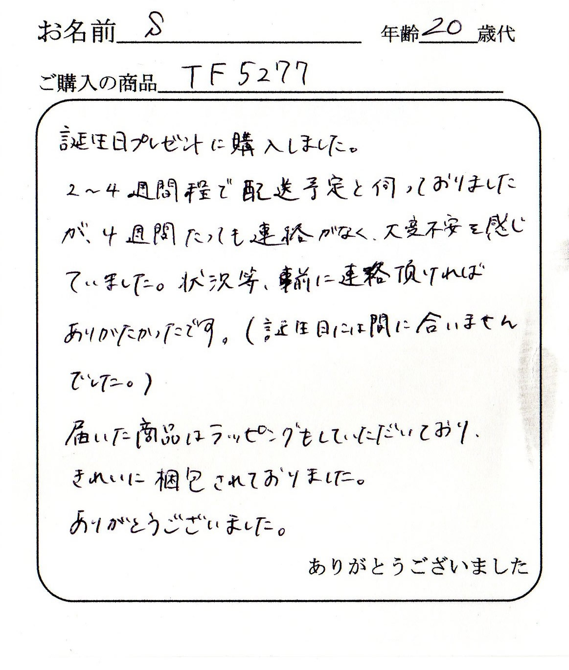 2〜4週間程で配送予定と伺っておりましたが、4週間たっても連絡がなく、大変不安を感じていました。状況等、事前に連絡いただければありがたかったです。(誕生日には間に合いませんでした。)